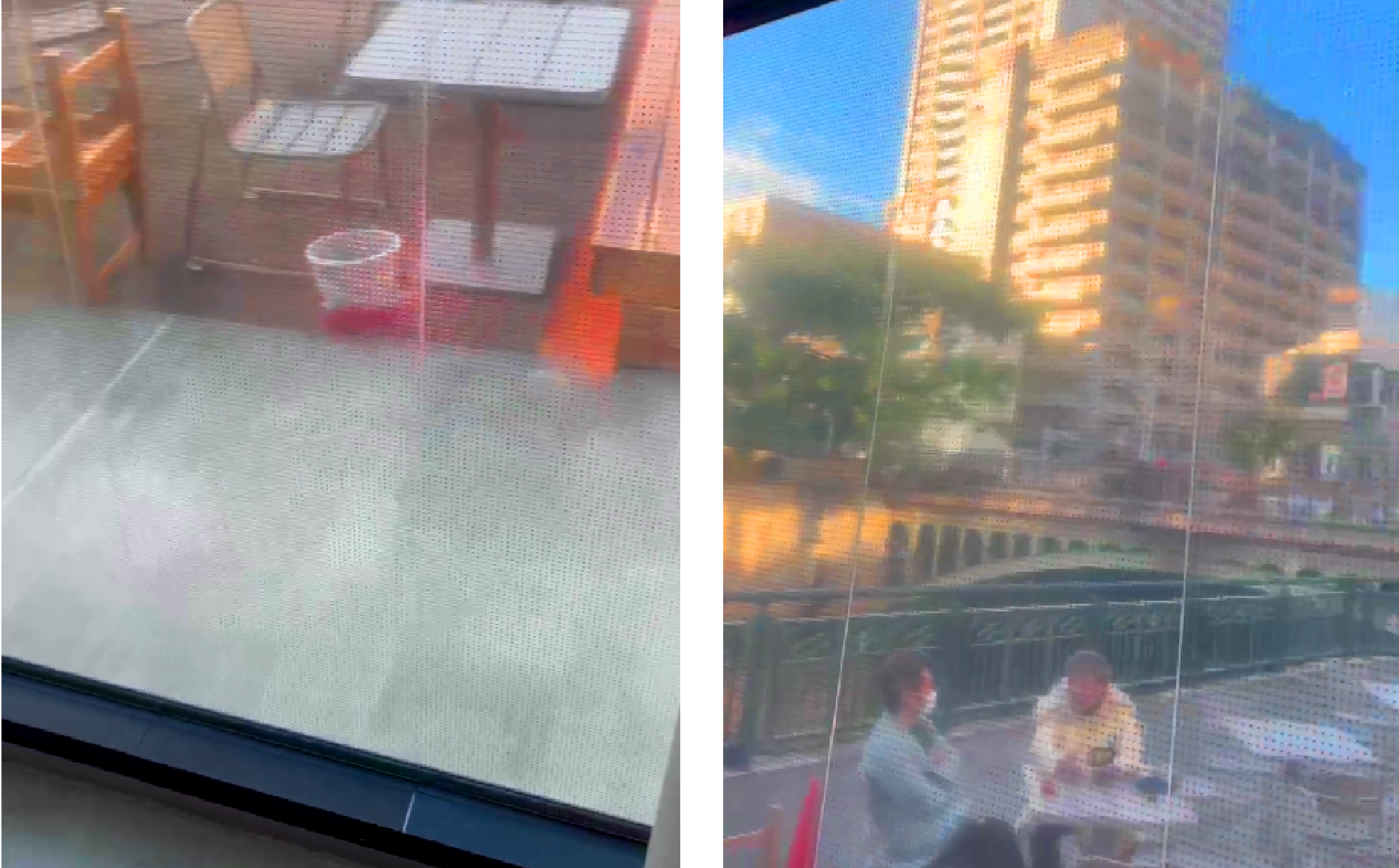 A series film screen is with high transrency (80%~97% optional), perfect for window shop installation, won’t block any views from inside. Can deliver advertising purpose and show indoor products at the same time.