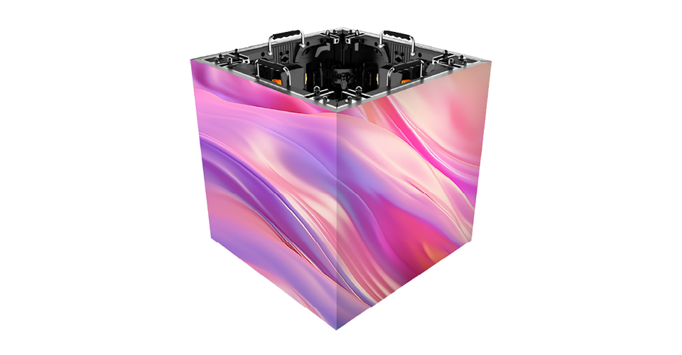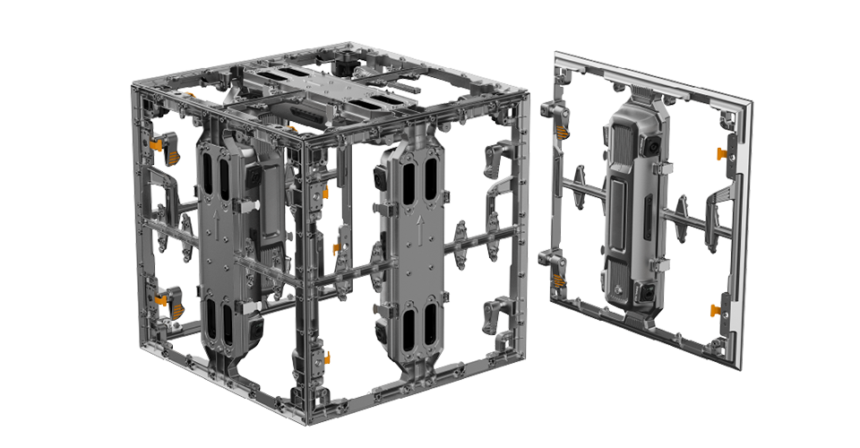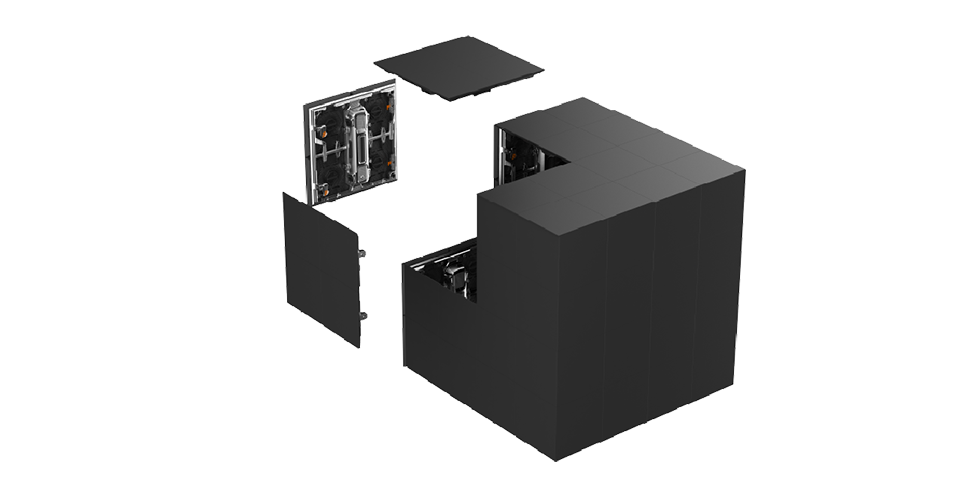 4-sided beveled cabinet and module make a complete cube screen, small gap 6.65mm between cabinet to cabinet at right angle part. Die-casting aluminum cabinet makes it more precise.
