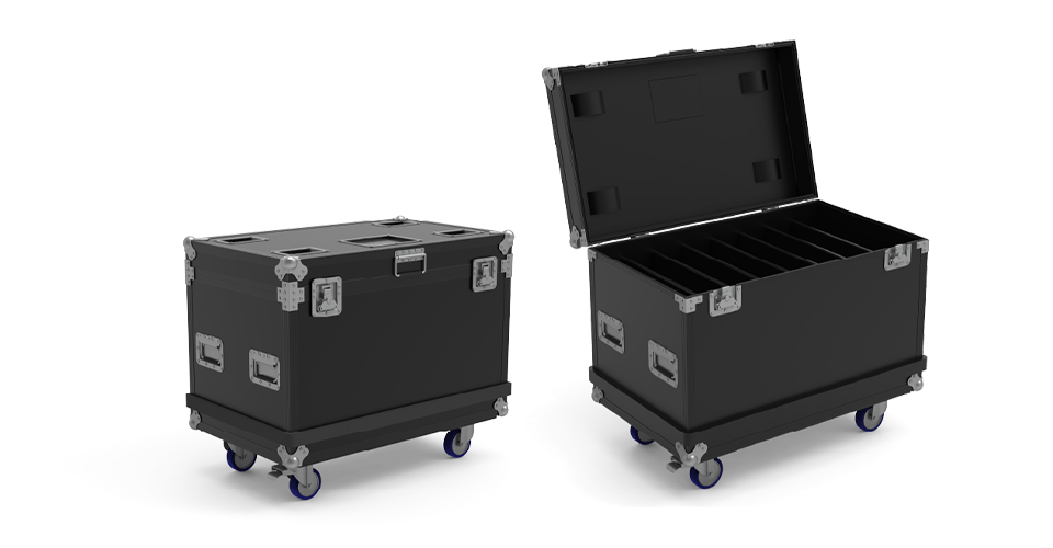 Flight case package with wheels, can be moved to various places. Composite honeycomb panel exterior, aluminum flight case frame, high density EVA and pearl foam. ABS plastic flight case is optional.