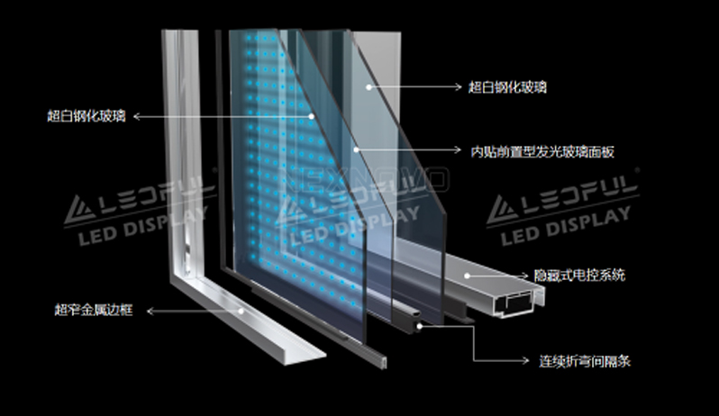 LED photoelectric glass: LED photoelectric glass is a kind of comprehensive technology products, integrated LED chip, driver chip, embedded control system, deep processing of glass, and chemical process. LED chip is placed between two pieces of glass, using glass coating conductive technology to achieve the effect of photoelectric display. The product has a longer lifespan, better display effect, higher temperature resistance, waterproof and other characteristics. At present, the photoelectric glass can be divided into monochrome static, monochrome dynamic, full-colour dynamic and other display types.