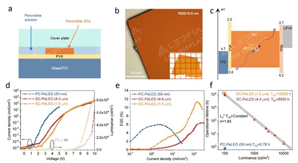Illustration: Schematic diagram of single crystal growth by spatial confinement method (a), microscope image of single crystal (b), device structure of perovskite single crystal LED (c), performance characterization of perovskite single crystal LED (d-f).