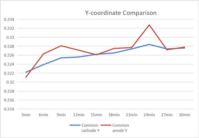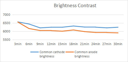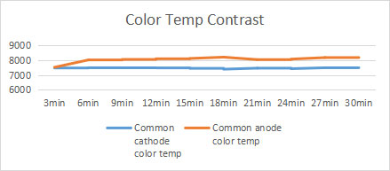 | Result analysis: The common cathode directly improves the common anode during the continuous rise of temperature. The common anode has obvious fluctuations in color fading (brightness, color gamut, color temperature). And it still maintains color consistency under extreme temperatures. | ||||||||