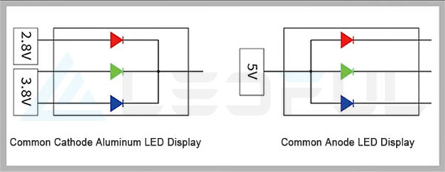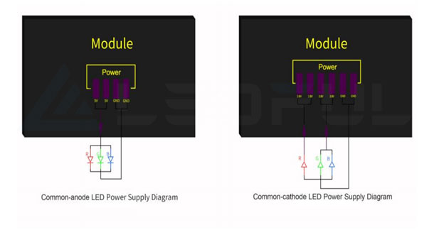 Since the current of the common cathode power supply first passes through the lamp beads and then to the driver IC, it avoids the voltage drop of the common anode power supply so that reduces the current loss. In addition, the precise and separate power supply for the red, green, and blue lamp beads can ensure that each lamp bead can work at an excellent voltage. Because different lamp beads require different voltages. Powering it alone can avoid more power loss and improve power utilization. In addition, the reduction in power consumption will also let the display module to generate less heat, ensuring its components have a longer service life.